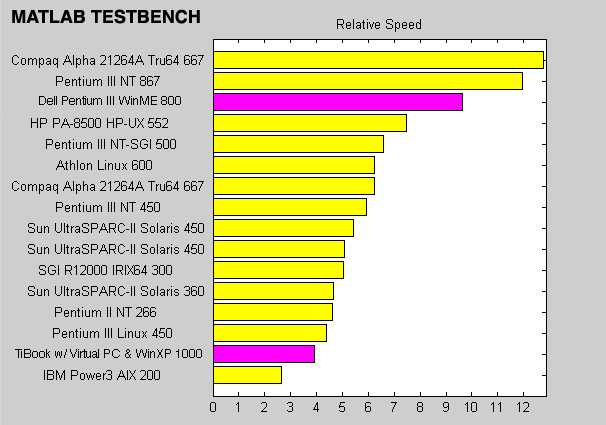 Ken and Kate want to know how fast Matlab runs under Virtual PC. So, here it is. I ran the "bench" command in Matlab R12 on my 1 GHz TiBook (using Virtual PC to run Windows XP) and my Dell Desktop Pentium III 800 MHz (running Windows ME*). Here are the compiled results from both tests: