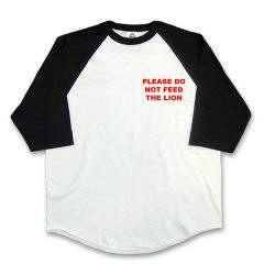 Please Do Not Feed the Lion (front), Lion piction (back). 100% pre-shrunk cotton with 3/4 sleeves. Your choice of red/white or black/white.
